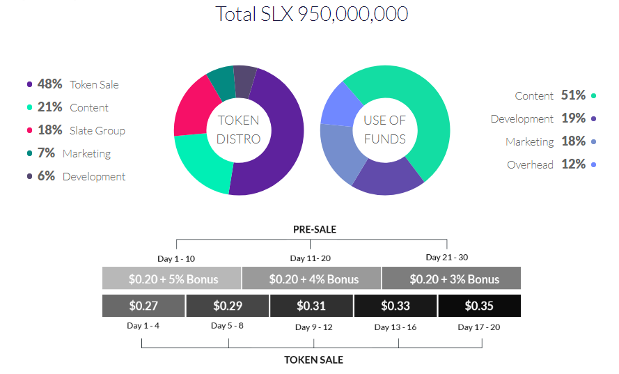 SLX adalah protokol utilitas cryptocurrency yang menggerakkan Ekosistem Hiburan Slate. Jaringan blockchain SLATE adalah buku besar umum untuk SLX dan mesin dari Slate Entertainment Services. Penjualan awal SLX akan memanfaatkan pengembangan Jaringan SLATE dan Ekosistem Hiburan Slate. Penjualan awal juga mendistribusikan SLX kepada para peserta di Jaringan SLATE sebagai penyedia layanan, konsumen, atau keduanya.